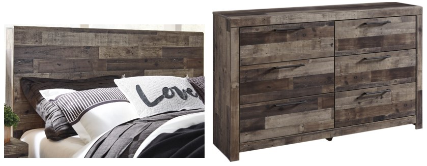 Walk the line between industrial and farmhouse styles with the modern heft of this panel headboard and dresser. A rustic butcher block finish is tastefully roughhewn with appealing color variations and imperfections. The substantial headboard is hearty and robust while the dresser provides roomy drawers with metal pulls in an antiqued gunmetal finish to complete this eclectic look.Read More