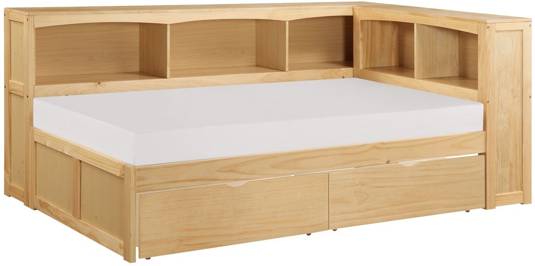 This transitional twin corner bookcase bed is featured in a natural pine finish making it an appropriate choice for a number of youth bedroom settings. The bookcase headboard allows for convenient storage within arm’s reach. The addition of the available double toybox units create an underbed solution to your storage needs.Read More