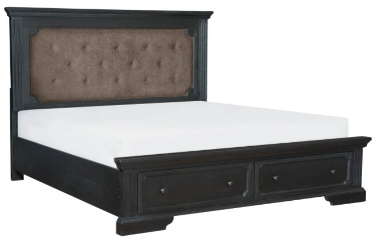 Rustic styling intersects with traditional lines in the design of the Bolingbrook Collection. The charcoal finish over pine solids and engineered pine veneer creates a warm complement to the elegantly framed queen platform storage bed. Providing subtle contrast to the groups finish is the button tufted neutral tone fabric headboard insert.Read More