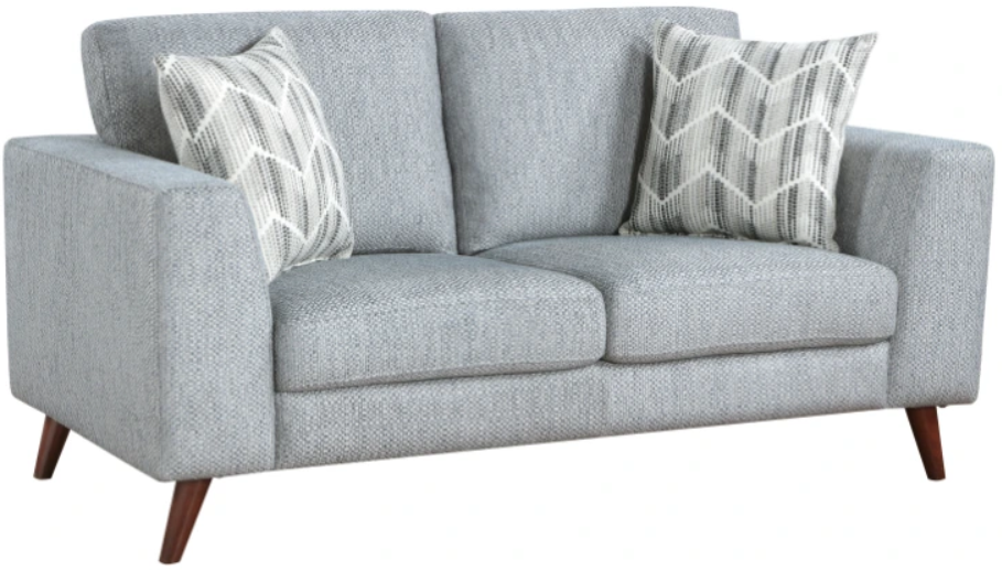 The soft, textured blue-gray fabric upholstery complements a variety of décor styles, while the faux wood brown finish legs provide a warm and stylish foundation. The clean lines and tapered legs embody the timeless aesthetic of mid-century design, making this loveseat a perfect addition to any living room, apartment, or small space. Enjoy the perfect blend of style, comfort, and functionality with this contemporary loveseat.
