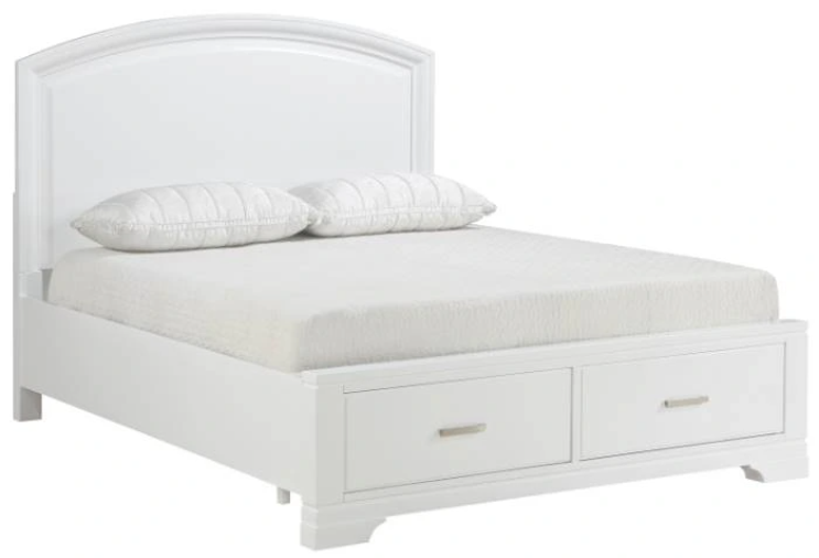 The intersection of modern lines and understated transitional style blend to create the Hudson Collection.The white finish of the queen bed presents a decoratively versatile addition to your bedroom. Polished chrome bar hardware fronts the storage drawers of the bed’s footboard.Read More