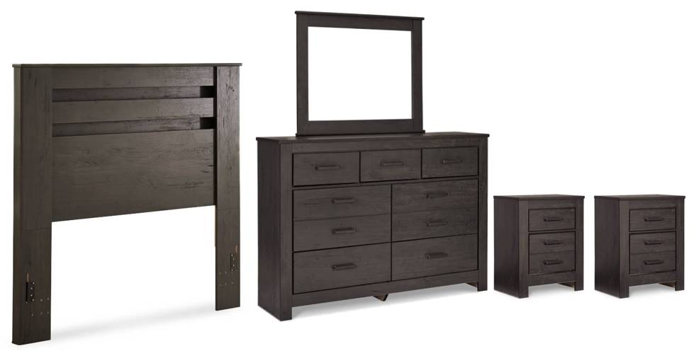 Includes Queen/Full panel headboard, 7-drawer dresser with mirror and two 2-drawer nightstands