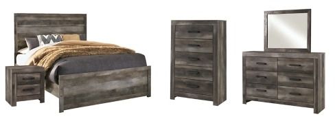 Includes queen panel bed (headboard, 2-drawer storage footboard, rails and slats), 6-drawer dresser with mirror, 5-drawer chest and 2-drawer nightstand