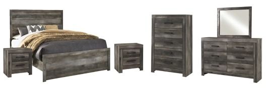 Includes queen panel bed with storage (headboard, 2-drawer storage footboard, rails and slats), 6-drawer dresser with mirror, 5-drawer chest and two 2-drawer nightstands